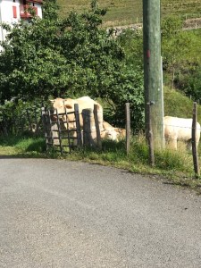 Plus, I was learning how to walk with walking poles. These proved to be invaluable, particularly on descents, but they took some time today getting used to. It’s like learning how to dance, with the right pole and left foot extending, and then the left pole and the right foot. I think that’s how it should go. I’ll need to review a YouTube video later. I must have been quite a sight. Not to mention the fact that I don’t have a simple walking stick. I have Black Diamond, lightweight, carbon-based trekking poles. These go along with my Columbia moisture-wicking tee shirt, my CoolMax socks, Salome hiking boots, and Osprey backpack. Some pilgrim! Oufit by Gucci. Fortunately, the only witness to this spectacle at the time was a single cow who, after looking for a time, nodded and walked away, as if to say to himself, “I’ve seen this before.”