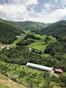 Because of the late start and my taking the valley route, I saw few people, mostly couples including ones from Denmark and Spain with whom I chatted some, all much younger than me. The first day took me through rolling countryside and farmland, small hamlets, and even the parking lot of a modern shopping center. In fact, that shopping center marked the border of France with Spain. No walls here.