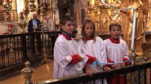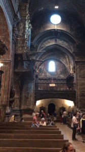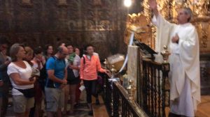 After making my travel arrangements, I went to the Pilgrim Mass at the Iglesia de Santa Maria de los Arcos. It was a Tuesday evening and this 12th century church was packed, a sign that it is not just pilgrims who are filling up the churches. I wondered if the decline of Catholicism in Europe is overstated. The local participants included not just older Spanish ladies with their veils and prayer books, but young families with children. The Mass concluded in the usual fashion: a blessing for the pilgrims, a memorial card, and a stamp in my credencial. After Mass, with others, I walked around the town square. It was a glorious summer evening here in Northern Spain. I felt incredibly peaceful and now looking forward to getting home.