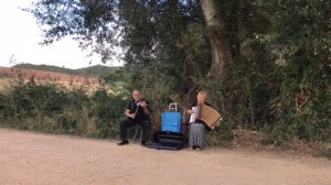 Going around the bend at one point on the trail near Luquin was a sight that perfectly fitted the Camino and my mood: an older man and woman playing a violin and accordion respectively along the side of the road. Music that was plaintive, sorrowful, but strangely soothing. For small donations, they entertained passing pilgrims. This reminded me of an entrepreneurial young Spaniard, a high school student I had guessed, whom I encountered on the way to Pamplona. His family’s house sat just off the Camino, but with some handmade signs, he had managed to steer me and others to a small detour so that we would pass directly in front of his family’s house — where he sold refreshing drinks. This kid had the world’s best location for a lemonade stand!